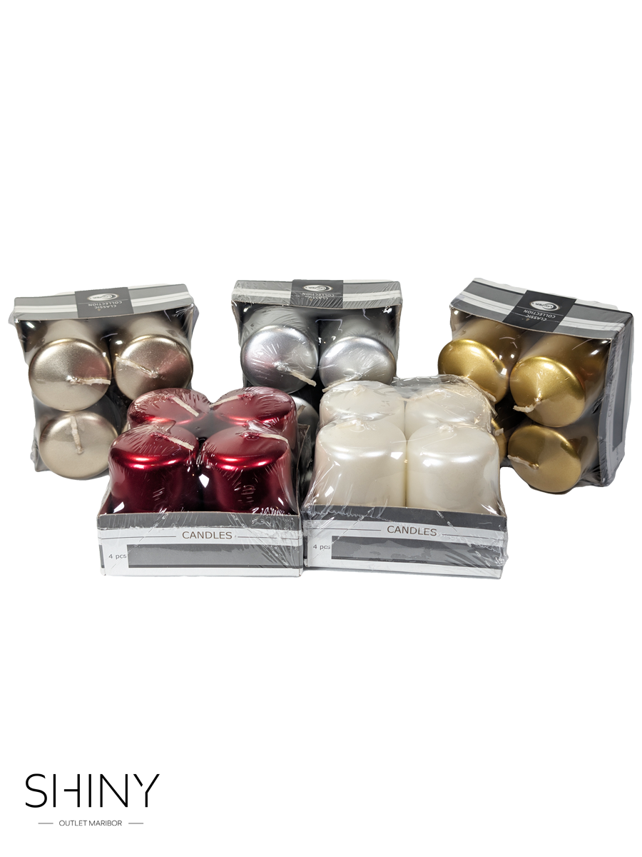 Set štirih adventnih sveč, višine 5 cm, v različnih barvah (rdeča, zlata, bela, srebrna in zlato-srebrna). Popolne za praznično okrasitev adventnega venčka ali doma. Barva je ob nakupu preko spleta naključno izbrana.