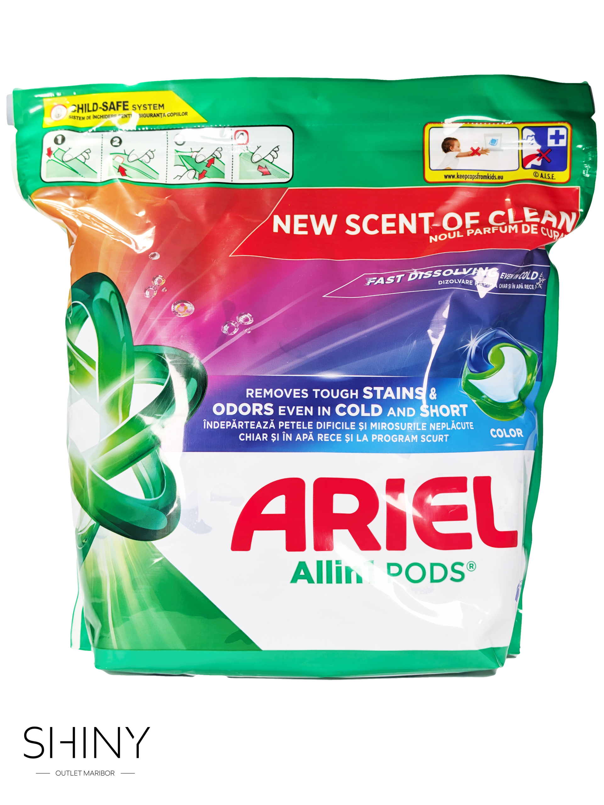 Ariel All-in-1 Color kapsule so predodmerjeni tekoči detergent, zasnovan za globinsko čiščenje barvnega perila. Učinkovito odstranjuje madeže, ohranja živahnost barv, ščiti tkanine in zagotavlja dolgotrajno svežino perila. Vsaka kapsula vsebuje popolno količino pralnega sredstva za eno pranje, kar omogoča enostavno uporabo brez razlivanja ali odmerjanja.
