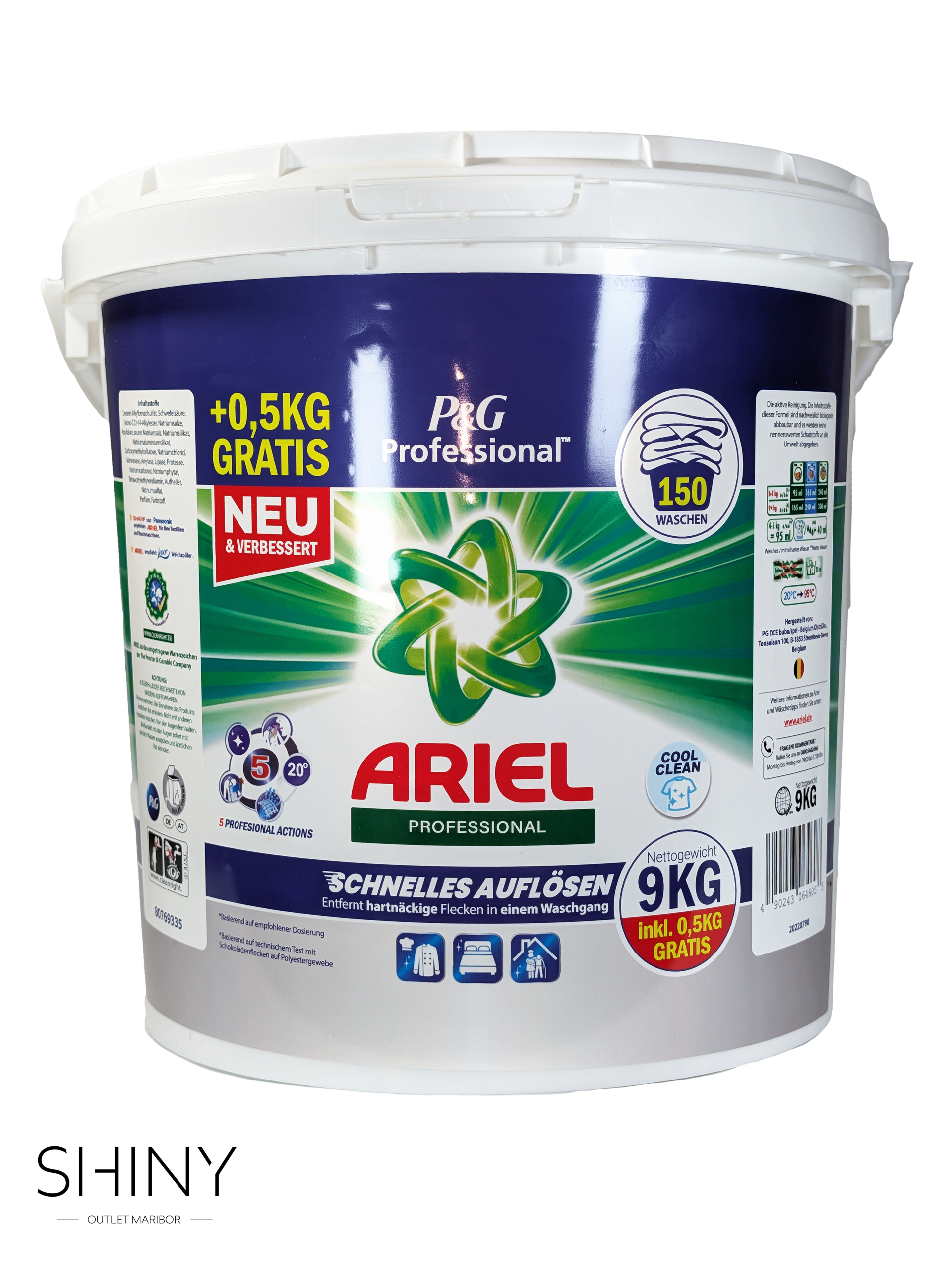 Ariel Professional prašek za pranje perila (9kg) je zanesljiv in visoko učinkovit detergent, zasnovan za globinsko čiščenje in odstranjevanje madežev že pri nizkih temperaturah (20–95 °C). Njegova napredna formula omogoča odlične rezultate pranja v vseh trdotah vode, zato je primeren tako za belo kot za obstojno barvno perilo. Zahvaljujoč kombinaciji aktivnih encimov, optičnih belil in močnih površinsko aktivnih snovi Ariel učinkovito odstrani trdovratno umazanijo, ohranja tkanine sveže, mehke in sijoče čiste. Prašek se hitro raztaplja in ne pušča ostankov, kar zagotavlja popoln rezultat pranja tudi pri kratkih programih.