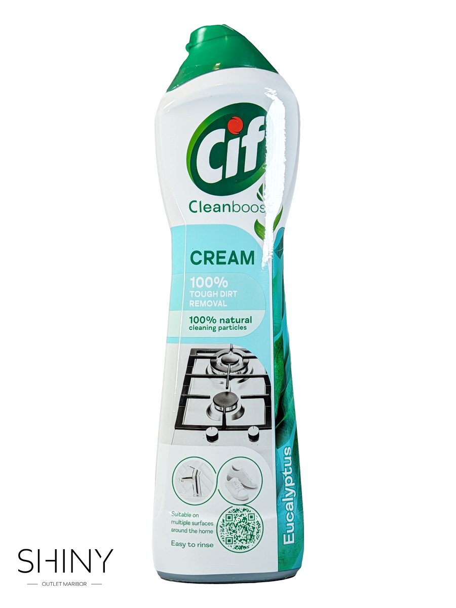 Cif Cream Evkaliptus (500 ml) je kremno čistilo z nežnim, sproščujočim vonjem evkaliptusa, zasnovano za temeljito odstranjevanje umazanije, maščob in vodnega kamna. Njegova bogata kremna formula z mikrodelci učinkovito čisti, ne da bi poškodovala površine, ter površinam vrača sijaj in svežino. Odlično se obnese v kuhinji, kopalnici ali na zunanjih površinah, kjer odstrani tudi najbolj trdovratne madeže.