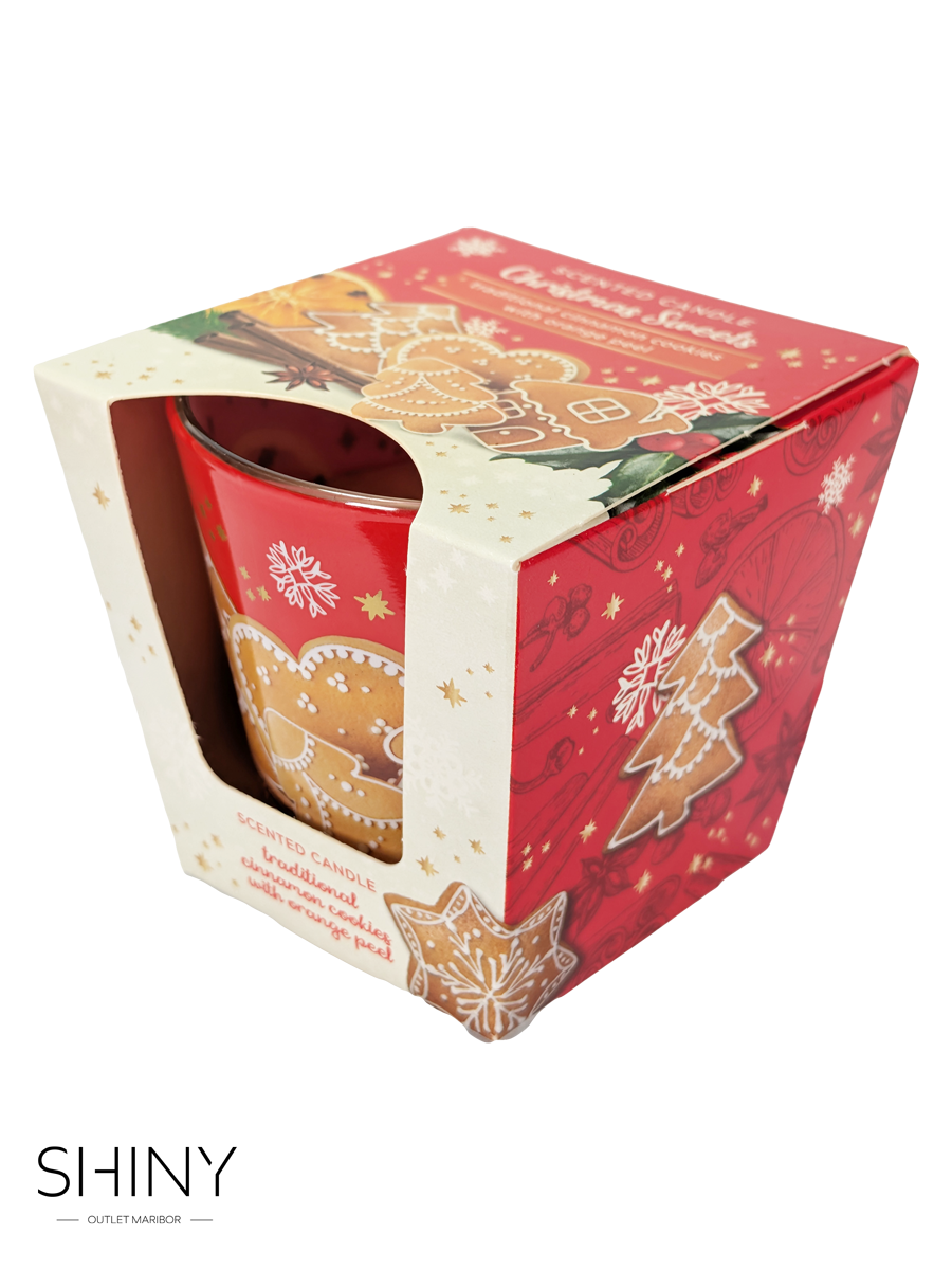 Dišeča sveča Cinnamon Cookies (115 g) – Božična dišeča sveča v steklenem kozarcu ustvari toplo, praznično in prijetno atmosfero doma. Sladek vonj cimeta, kot sveže pečeni piškoti. Sveča je v dekorativni embalaži, primerna tudi za darilo.