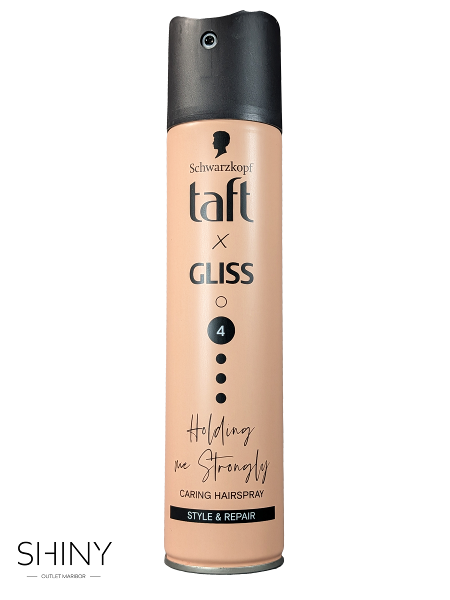 Taft x Gliss – Lak za lase Style & Repair (stopnja 4) zagotavlja močno obstojnost in zanesljivo fiksiranje pričeske, hkrati pa pomaga zaščititi lase pred izsušitvijo in zunanjimi vplivi. Formula Style & Repair ohranja naraven videz las, omogoča gibljivost pričeske ter zagotavlja dolgotrajen učinek brez lepljenja.