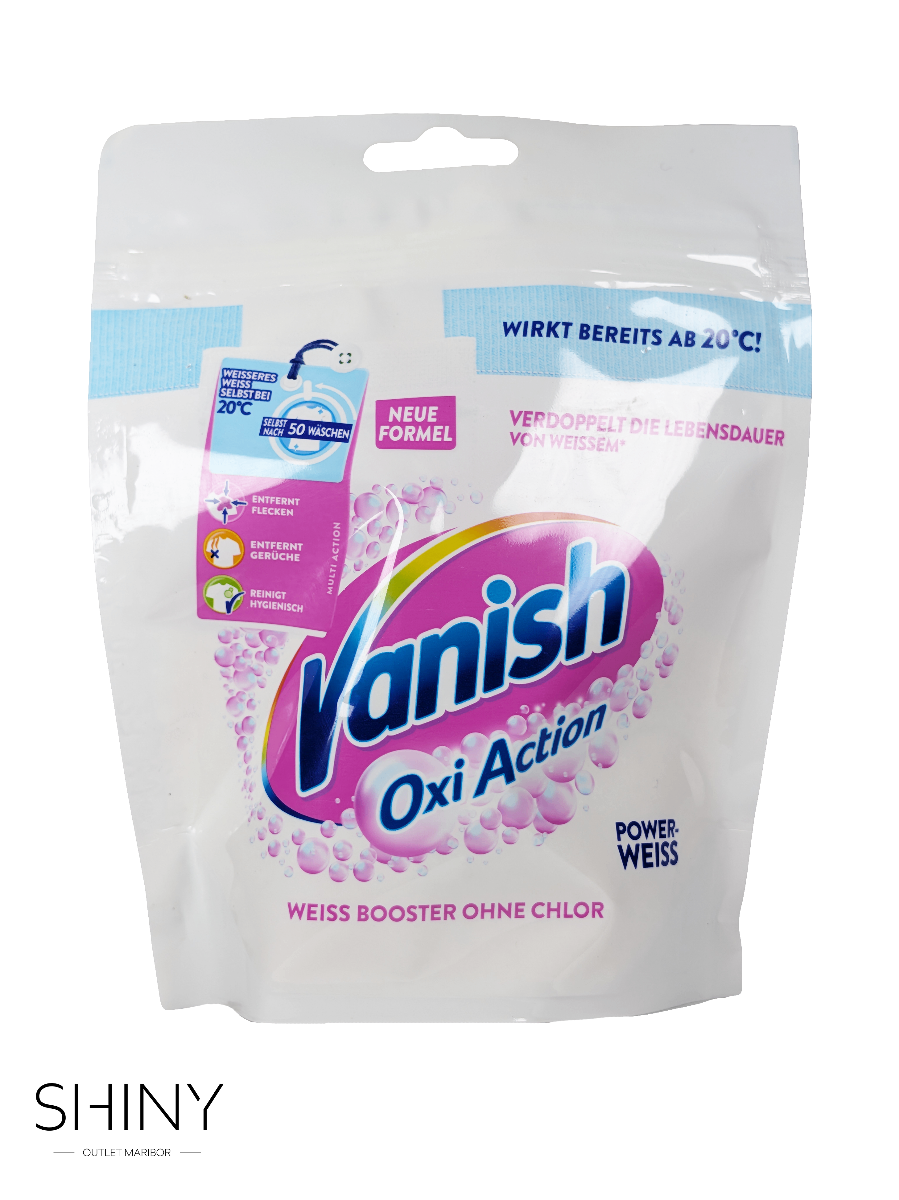 Vanish Oxi Action White (250 g) – prašek za odstranjevanje madežev učinkovito odstranjuje tudi najtrdovratnejše madeže, zahvaljujoč formuli s kisikovim belilom, ki prodre globoko v vlakna tkanin. Primeren je za belo perilo, saj vrača belino oblačilom. Pomaga pri odstranjevanju madežev od hrane, pijač, trave in drugih vsakodnevnih nečistoč.